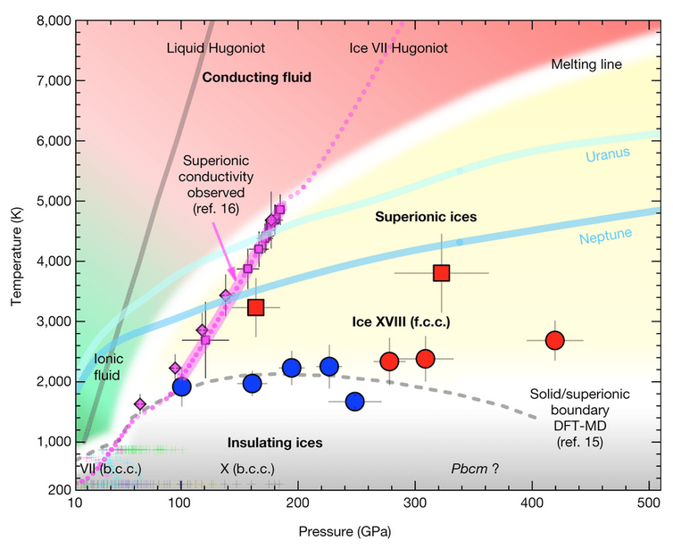 These ice types are called superionic ice and were first measured in 2019 by blasting lasers at diamond anvils. They may contribute to Uranus and Neptune’s magnetic fields.